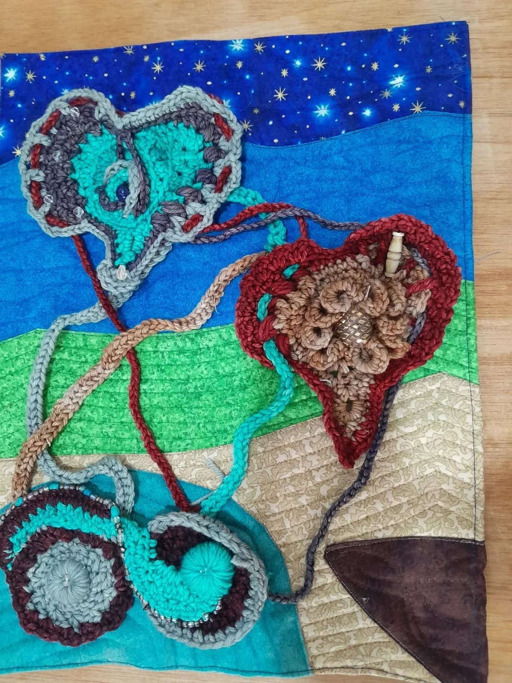 Colorful textile art featuring yarn hearts connected by yarn strands on a fabric background with starry night, green hills, beige sand, and a dark corner.