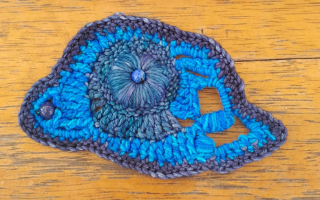 Embellishments were purchased decades ago: (1) a large natural Lapis Lazuli bead in dark blue and (2) a small natural Lapis Lazuli bead in a lighter blue in the crocheted button.