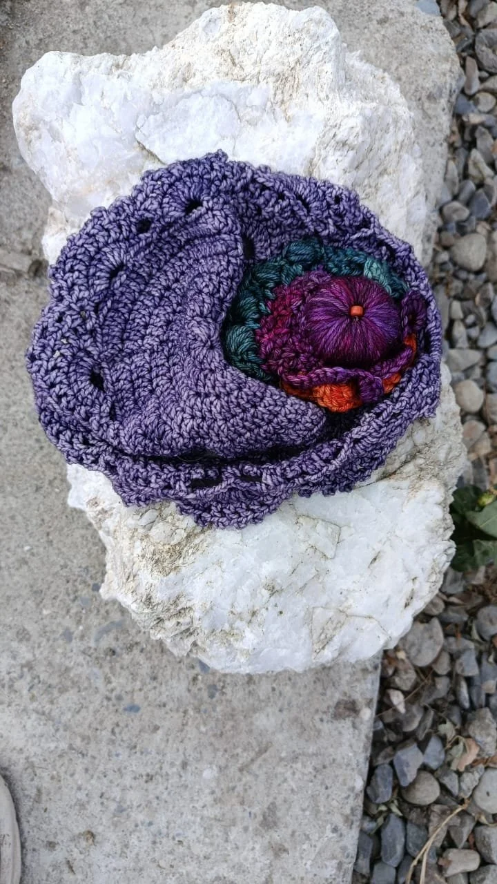 Jacquie Omi (Omi = Grandma in Galician) often sits outside on the patio of the Summerland Permaculture Project near Malacatos, Loja, Ecuador, South America. Typically, she draws inspiration from nature. In the radiant sunlight. Usually, she selects two or three colors of natural yarn to design and create something. She is an expert fiber artist and a retired professor of exceptional students. She encourages the natural touch of native yarns to ease stress from anxiety, pain, depression, isolation, grief, fear, and other physical or emotional challenges, as well as the assurance that the hands are on natural products. Each hand-crocheted item is made from strong yet soft natural fibers. All her work invites you to touch, smell, twist, stroke, or handle in various ways, and to pack it into a small space, only to unpack it and renew your ecologically conscious lifestyle.