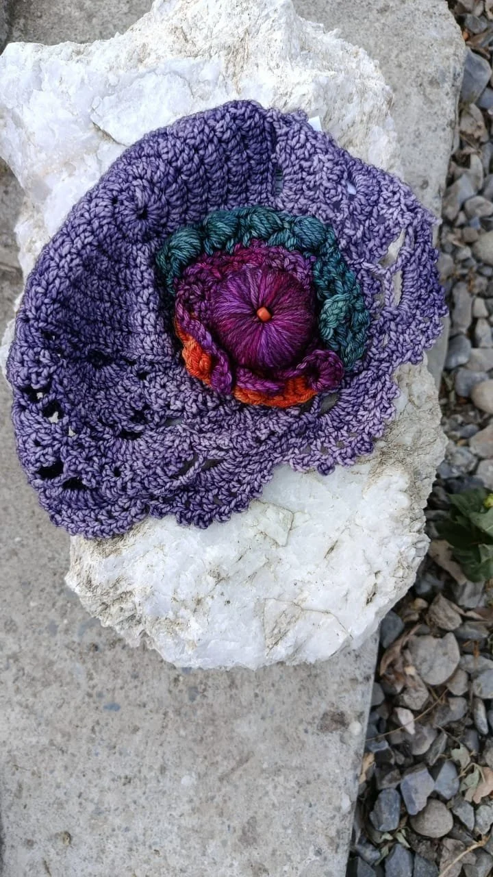 The cap is from 90% Cotton and 10% Cashmere sport-weight yarn by Autumn Wind; the slightly modified pattern was free. The OTTA attachment is an original design, crafted from 100% washable, hand-dyed 4-ply wool in Peru by Ríos Malabrigo. The attached trinket is a crystal bead inside a crocheted button. The hat size is Medium-Large. To clean or to retighten the yarns, ash by hand, dry flat on a table or trivet. The “Labor of Love” is approximately three hours, with a 3.5 hook, and another hour for the OTTA (Original Touch Therapy Art).