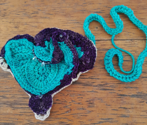 This is an original, one-of-a-kind free-form crocheted heart and vein made of Malabrigo Rios, a soft, strong, washable 100% Superwash Merino 4-ply wool yarn that was hand-dyed in Peru in limited quantities of 10 skeins. The overall size is 5.5 inches wide and 5 inches tall, plus two arm’s length of crocheted strings representing the veins/arteries. In the center of the six-pointed star is a lapis lazuli gemstone. You might want to incorporate this into your life in any way that suits you: to sew on jeans, a shirt or sweater, a blanket, a pillow; sitting on a table, pinned to a curtain, or under your pillow at night.