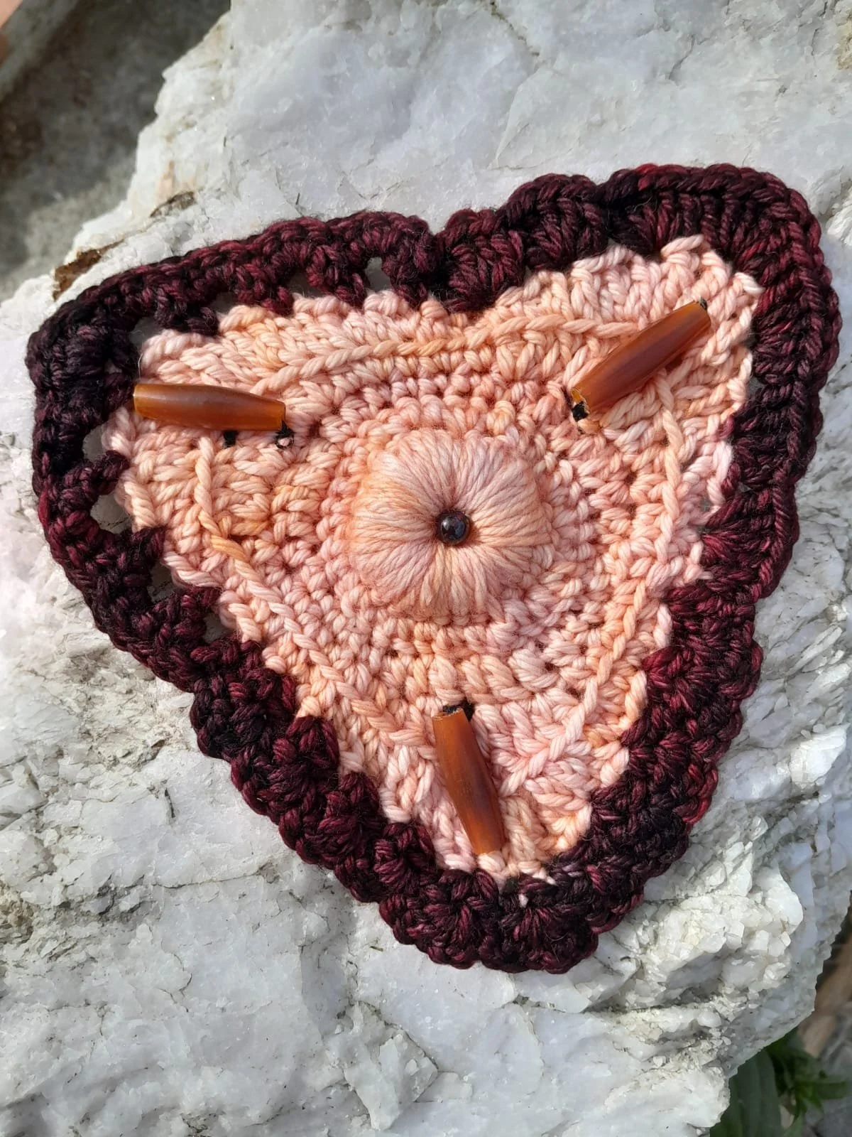 Emblishments are (1) a small natural Garnet Bead in the crocheted button and (2) three natural bone-like beads of unknown natural origins.
